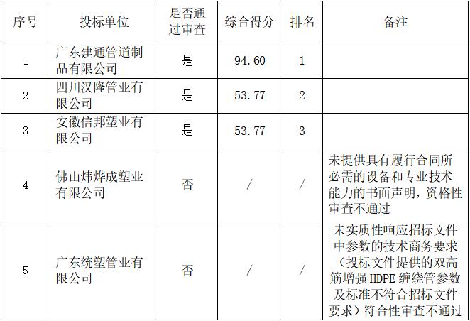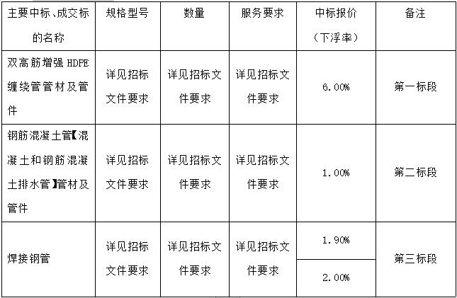 第一標(biāo)段中標(biāo)供應(yīng)商名稱:廣東建通管道制品有限公司;中標(biāo)報價下浮率:6.00%。